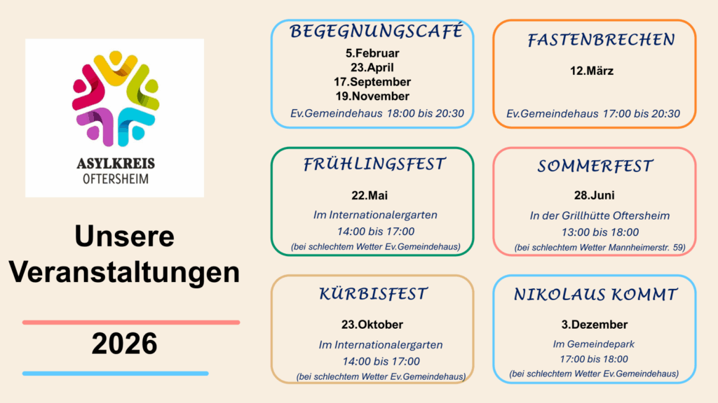 Der Asylkreis Oftersheim startet gemeinsam mit Familien, Freunden, Ehrenamtlichen und allen Interessierten in ein neues Jahr voller Begegnungen. Am Donnerstag, den 5. Februar 2026, öffnen sich ab 18 Uhr die Türen des evangelischen Gemeindehauses für das erste Begegnungscafé 2026.